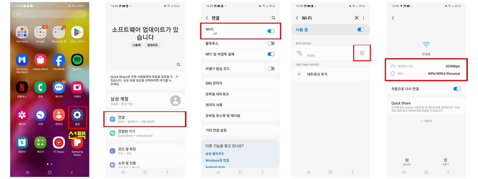 ① Android 기기의 경우 "설정" > "연결" > "Wi-Fi"로 이동하여 "Wi-Fi 상태"를 누르면 다운로드 속도와 업로드 속도를 확인할 수 있습니다.