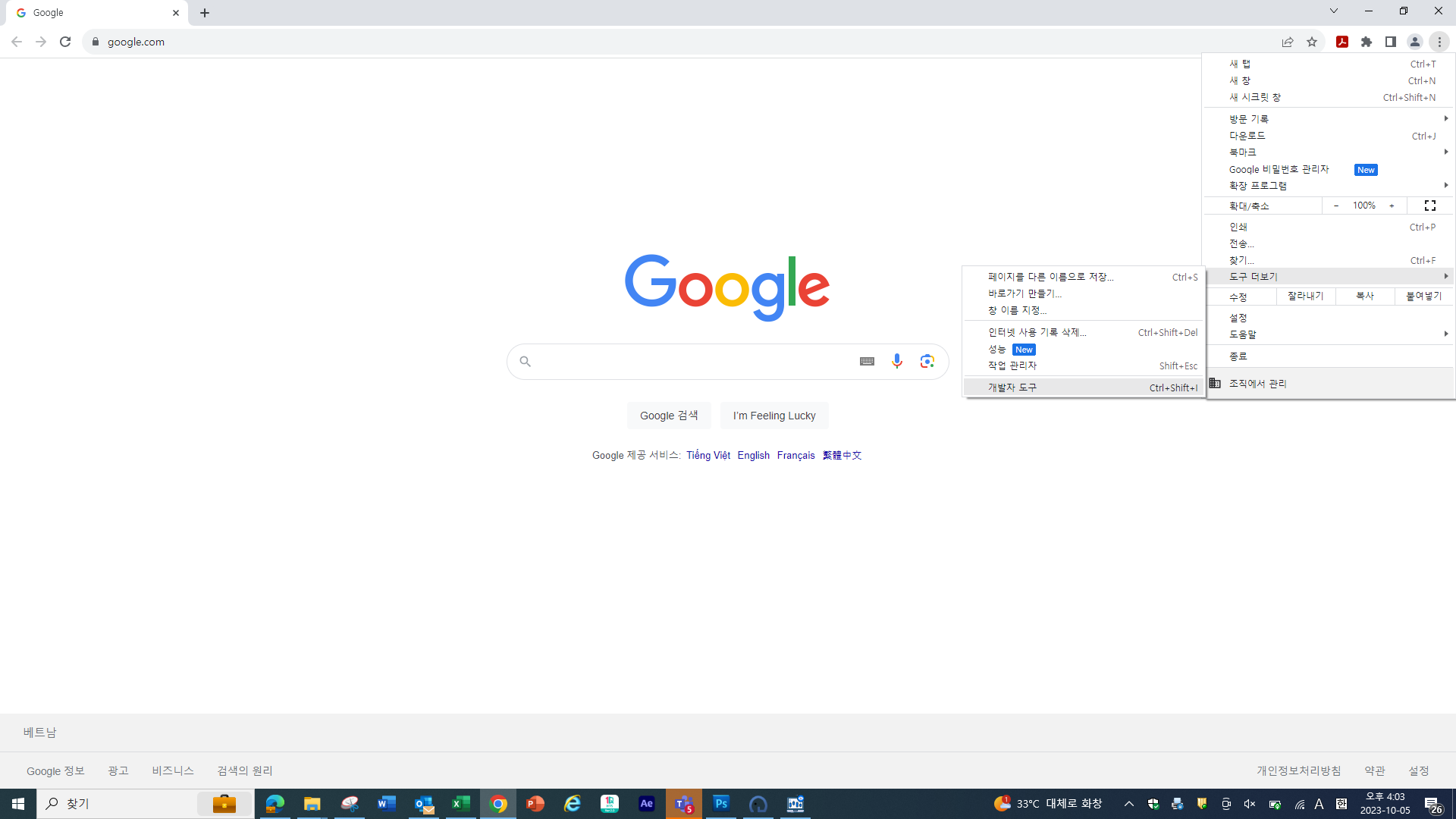 ② F12 키를 누르거나 도구 더보기 > 개발자 도구를 선택하여 개발자 도구를 엽니다.