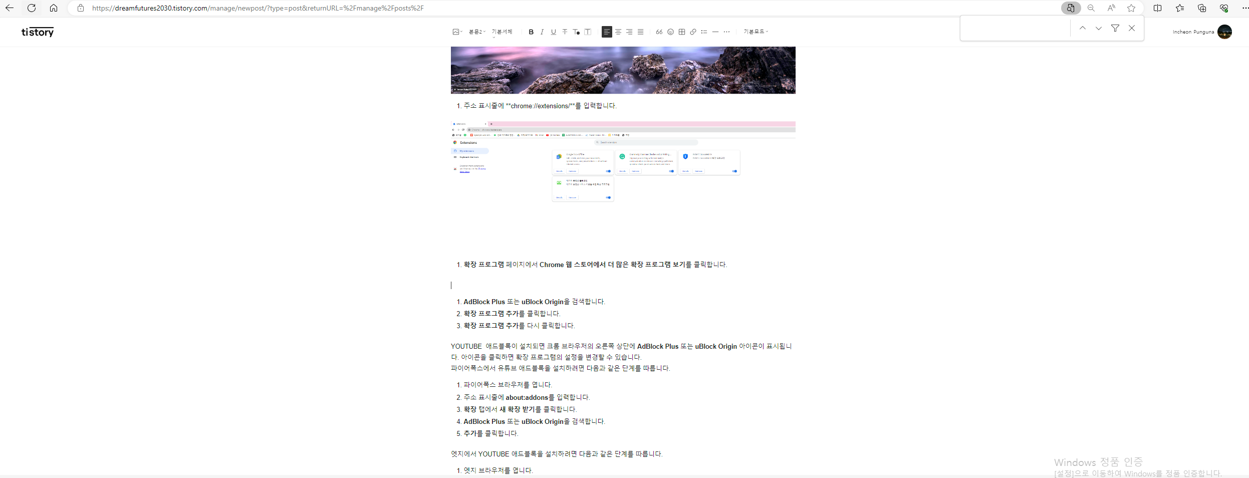 엣지(Microsoft Edge) 에서 YOUTUBE 애드블록(Ad Blocker)을 설치하려면 다음과 같은 단계를 따릅니다.